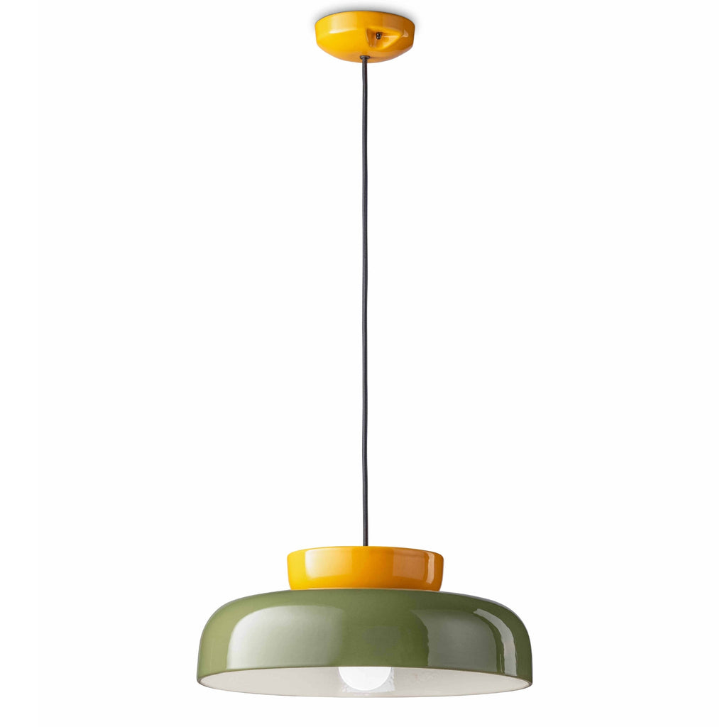 This lamp is composed of two parts: the bowl-shaped upper part is made of ceramic and the lower part is made of painted and natural glass. Its round shape recalls the structure of stadiums and arenas. Its name refers to the Brazilian stadium par excellence: Maracanà.