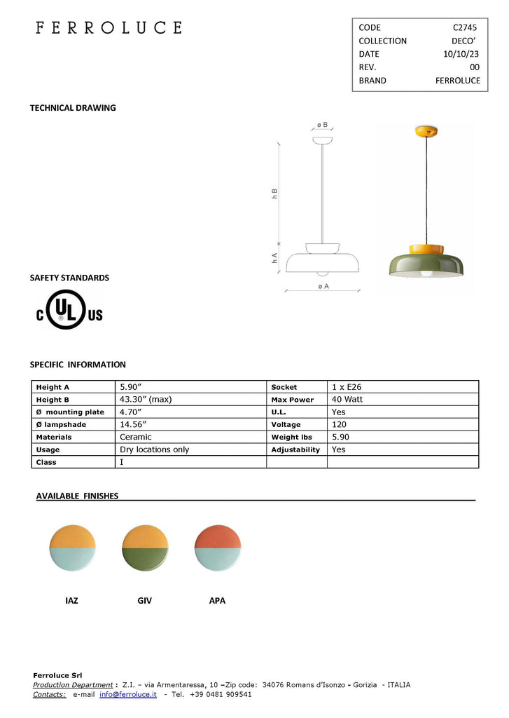 Made in Italy by Ferroluce. UL listed.