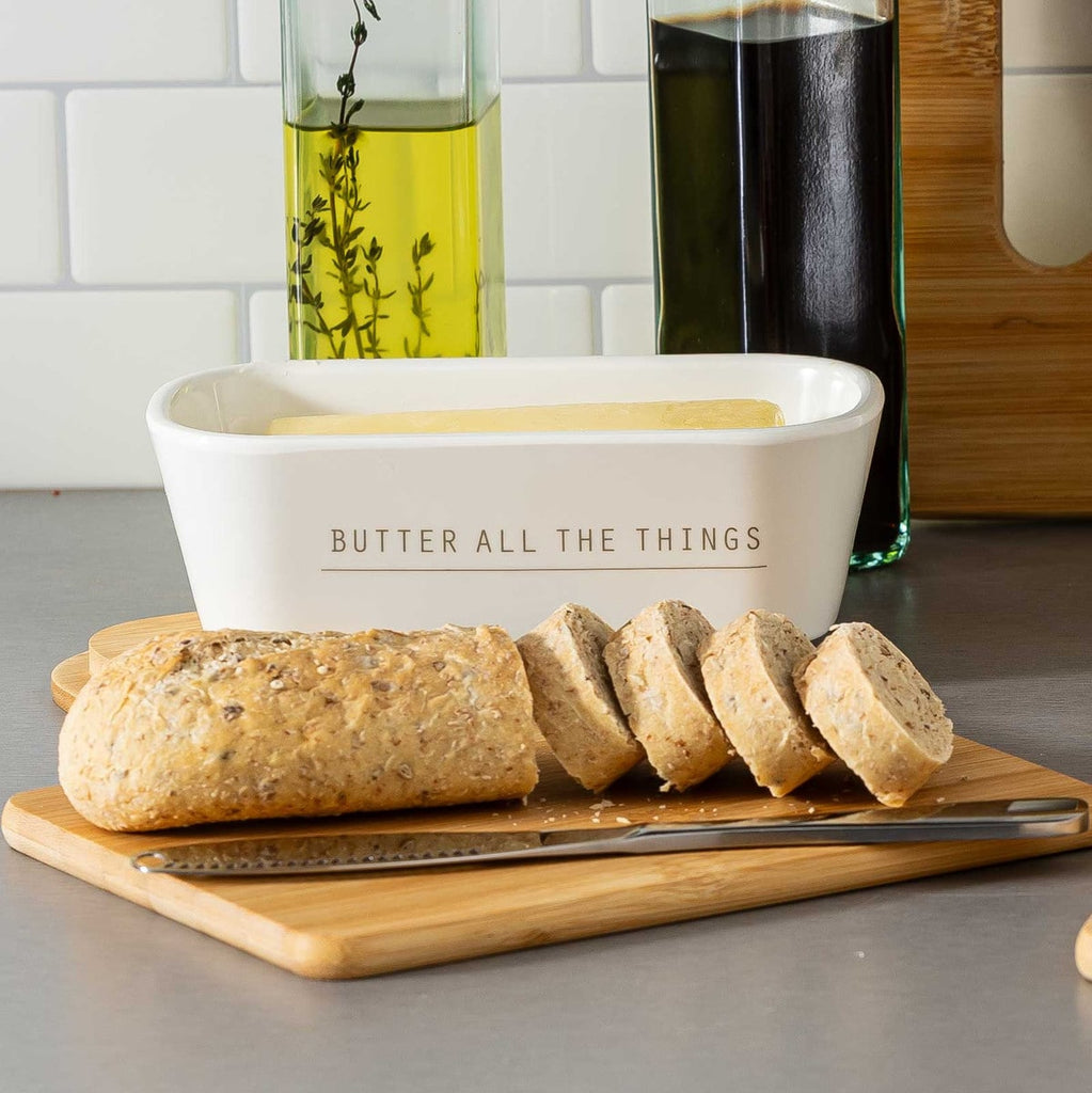 While laying out the breakfast table, don't forget the butter dish! Brighten up your kitchen with this stylish and practical butter dish from the Crofthouse Collection. Featuring a durable beige melamine body and a natural bamboo lid, it’s designed to keep your butter fresh while adding a contemporary flair. The playful "Butter All the Things" slogan, etched with a subtle underline, brings a fun, cheeky vibe to your table. Perfectly sized to hold one stick of butter, this dish is both functional and delightful—an essential for every breakfast spread!