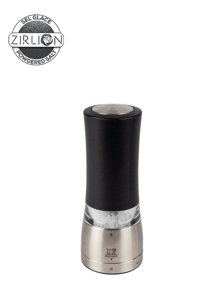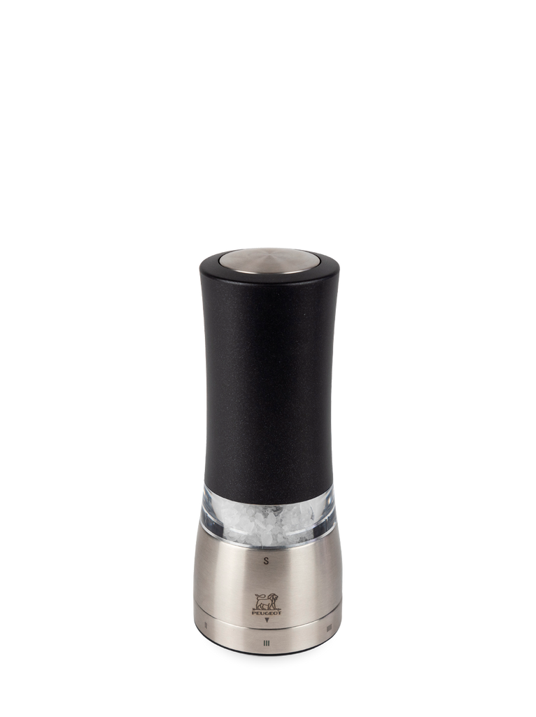 The 16 cm u'Select electric salt mill is an elegant combination of stainless steel with an iridescent black finish. This electric salt mill can be used, conveniently, with just one hand: simply press the button to season your dishes while cooking. When in use, a light comes on at the bottom, allowing you to check how much salt you are grinding. Bring a touch of sophistication to your table with the iridescent black u'Select electric salt mill. Its Zirconia mechanism, an innovation from Peugeot Research and Development, delivers extremely fine Powdered Salt, offering the taste pleasure of salt while limiting the quantity used. Its u'select grind adjustment system, also exclusive to Peugeot, offers 6 grinding control positions to adjust your dry salt grinding size perfectly from powdered salt to crunchy salt.