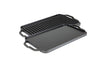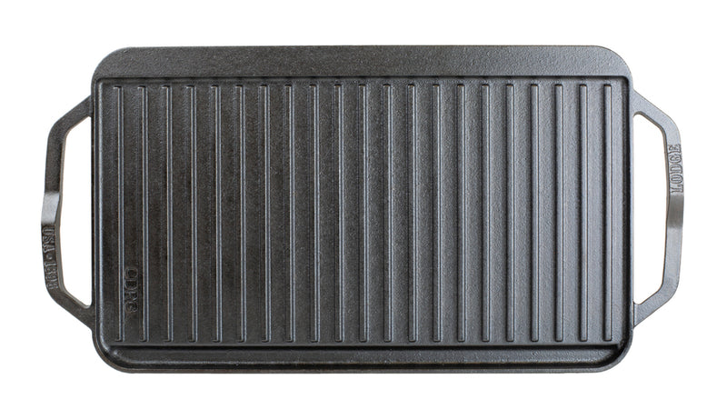 Grill. Griddle. Repeat for ever and ever. This hardworking piece of cast iron is crafted in America with iron and oil and doubles as a grill and griddle. The naturally seasoned cooking surface is ready to help you do double duty and delivers meals to the table with sizzle and style. Fits over two stovetop burners. Seasoned and ready to use.