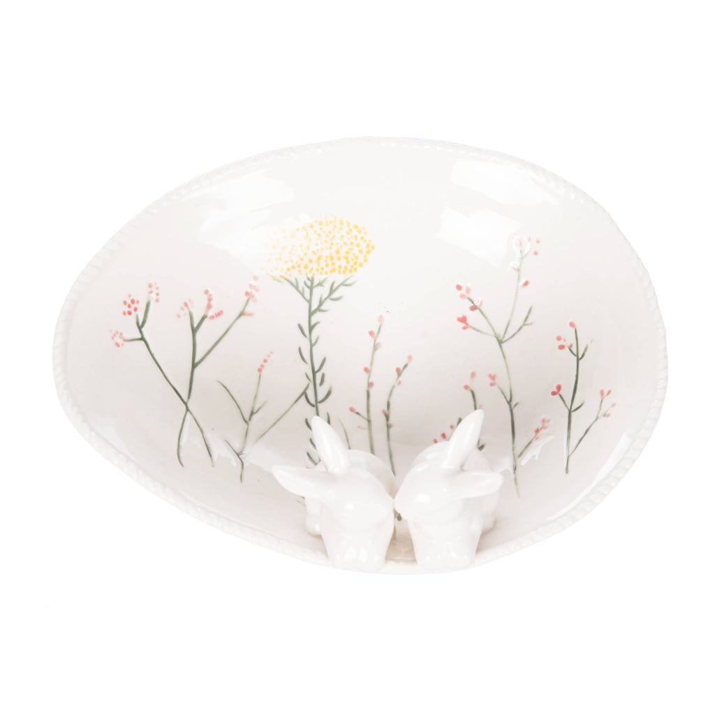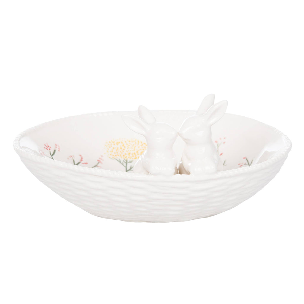 Add a whimsical touch to your spring decor with this beautifully crafted stoneware dish. Featuring adorable kissing bunnies nestled along the rim and delicate spring florals adorning the inlay, this dish is a perfect blend of charm and elegance. The textured edges enhance its visual appeal, making it a standout piece for your Easter gatherings, spring celebrations, or as a delightful addition to your seasonal tableware collection. Ideal for serving treats, displaying decorative items, or as a thoughtful gift, this stoneware dish brings a touch of nature-inspired beauty and seasonal flair to any home.