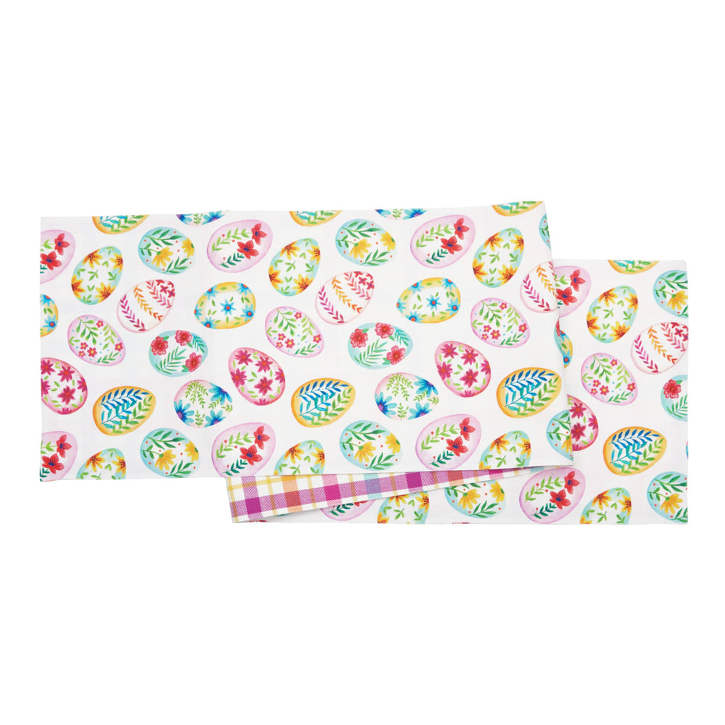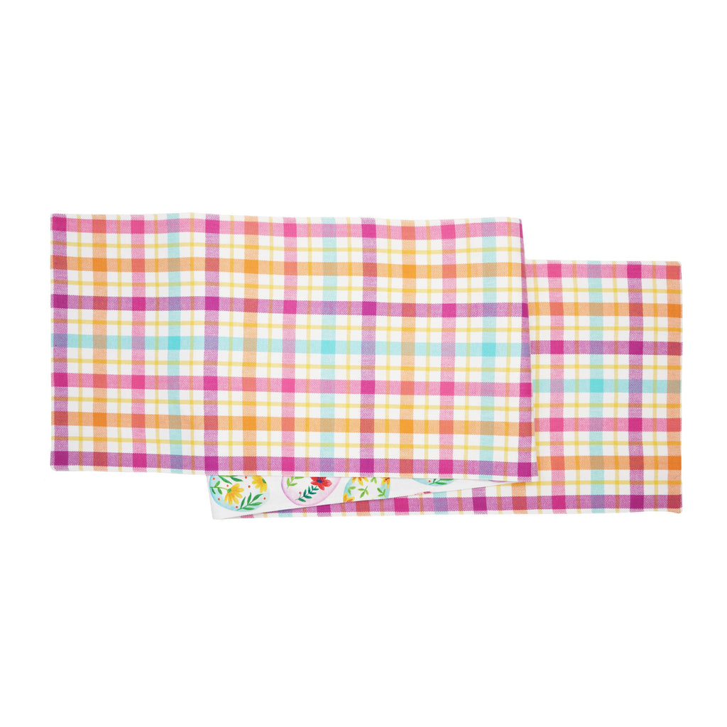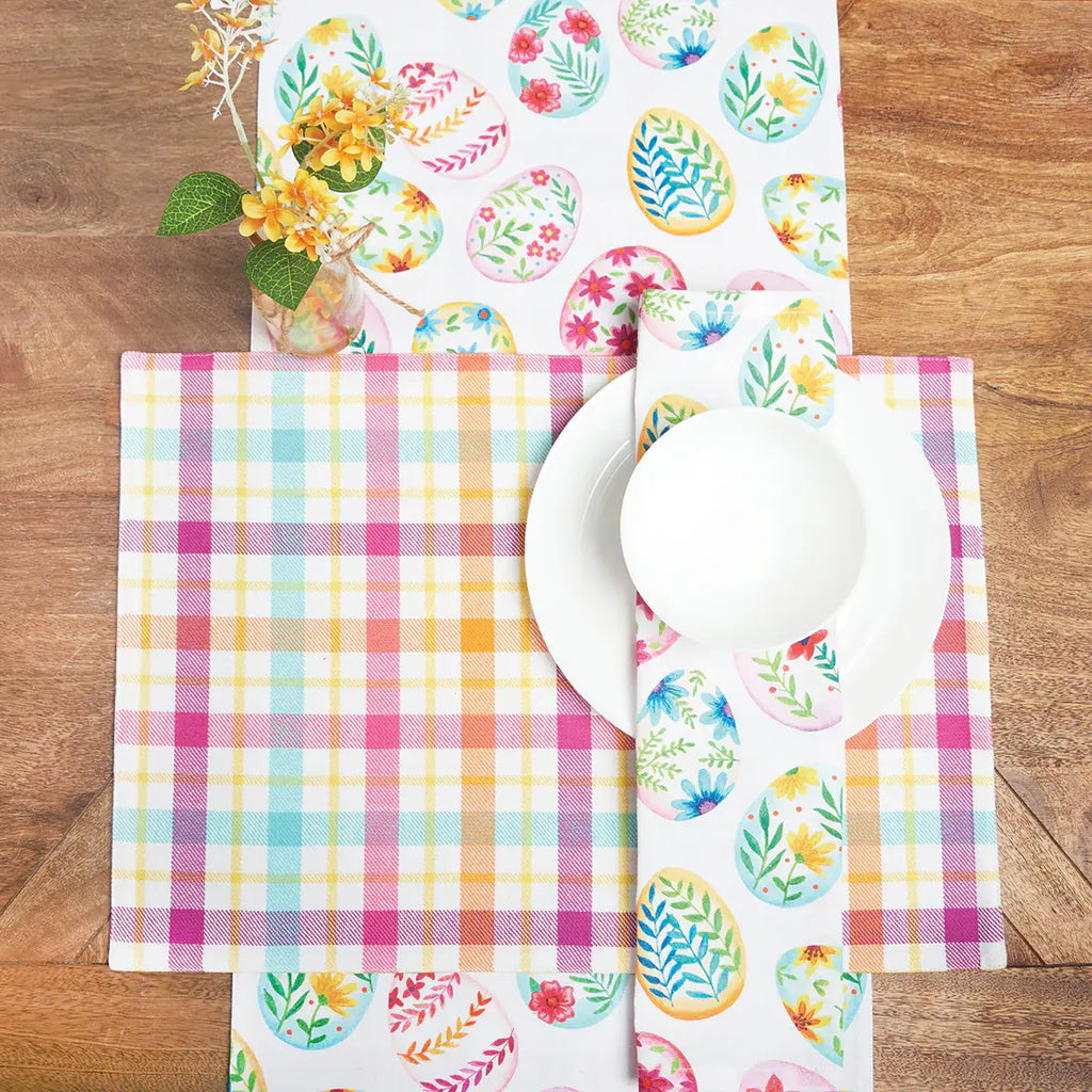 The Easter Egg Charm & Plaid printed table runner is a vibrant addition to springtime table decor. These table linens showcase artistically adorned eggs, each with intricate details and floral motifs, presented in an array of cheerful colors. A colorful plaid pattern perfectly complements these delightful table linens.