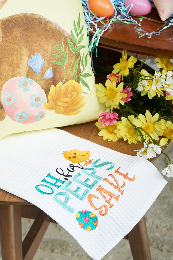This Easter kitchen towel is crafted from cotton and embroidered with a festive design, perfect for adding a touch of whimsy to your kitchen's decor.
