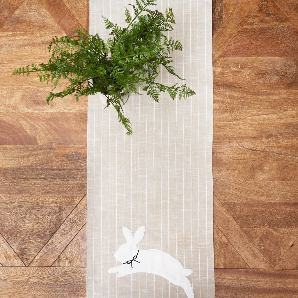 Featuring a neutral background with delicate white stripes, the White Bunny Hop Stripe table runner is adorned with a charming white leaping rabbit, complete with a delicate bow around its neck. Perfect for hosting elegant Easter celebrations, these linens add a touch of whimsy and sophistication to any table setting.
