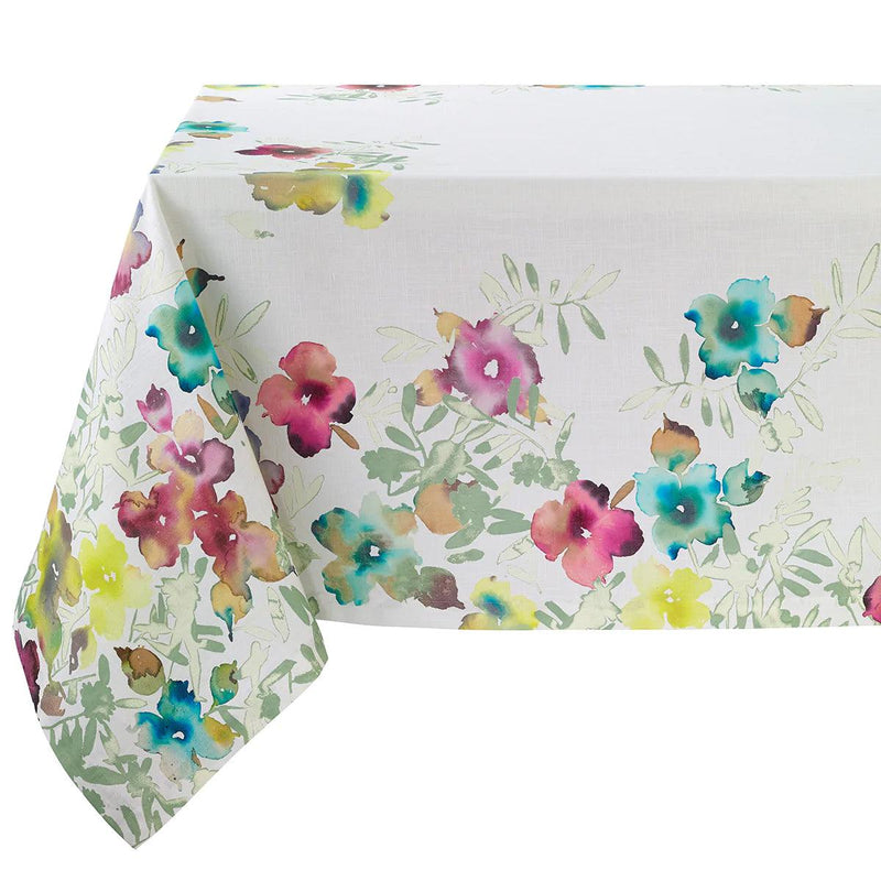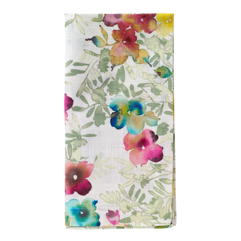 It has a beautiful floral print that appears to be hand-painted in vibrant watercolors of turquoise, lemon, and berry.