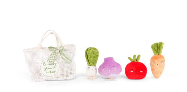 Fresh from the pretend patch‚ it’s the Farmer’s Market Play Tote! This adorable set is packed with the cutest plush veggies around: a smiling carrot, radish, tomato, and scallion, each with fun squeak-and-rattle features for extra sensory play. Nestled in a sweet little market bag with a bow, it’s garden-to-giggle fun for budding chefs, mini gardeners, and veggie-loving kiddos alike!