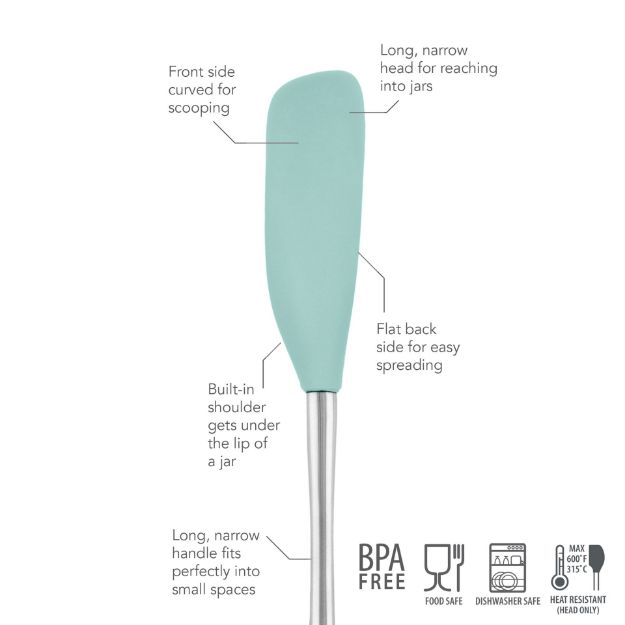 - Clean Out Jars: Narrow, angled head fits into small jars and corners to scoop out the last bit. Curved head scoops; flattened back spreads. The curved shoulder swipes smoothly along the lip of a jar.