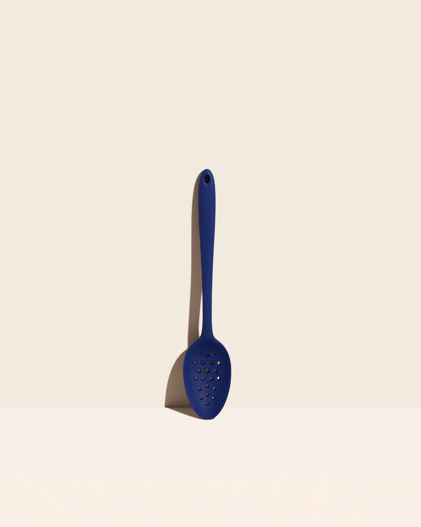 The Perforated Spoon features a branching hole pattern that allows for fast straining as well as precise skimming. A deep bowl for stirring and serving, a graceful handle, and just enough flex at the edges.