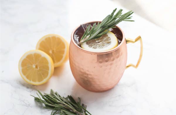 Hang it in the kitchen or hold it in your hand with the solid brass handle. It brims with the classic concoction of vodka, ginger, lime, and fresh mint.