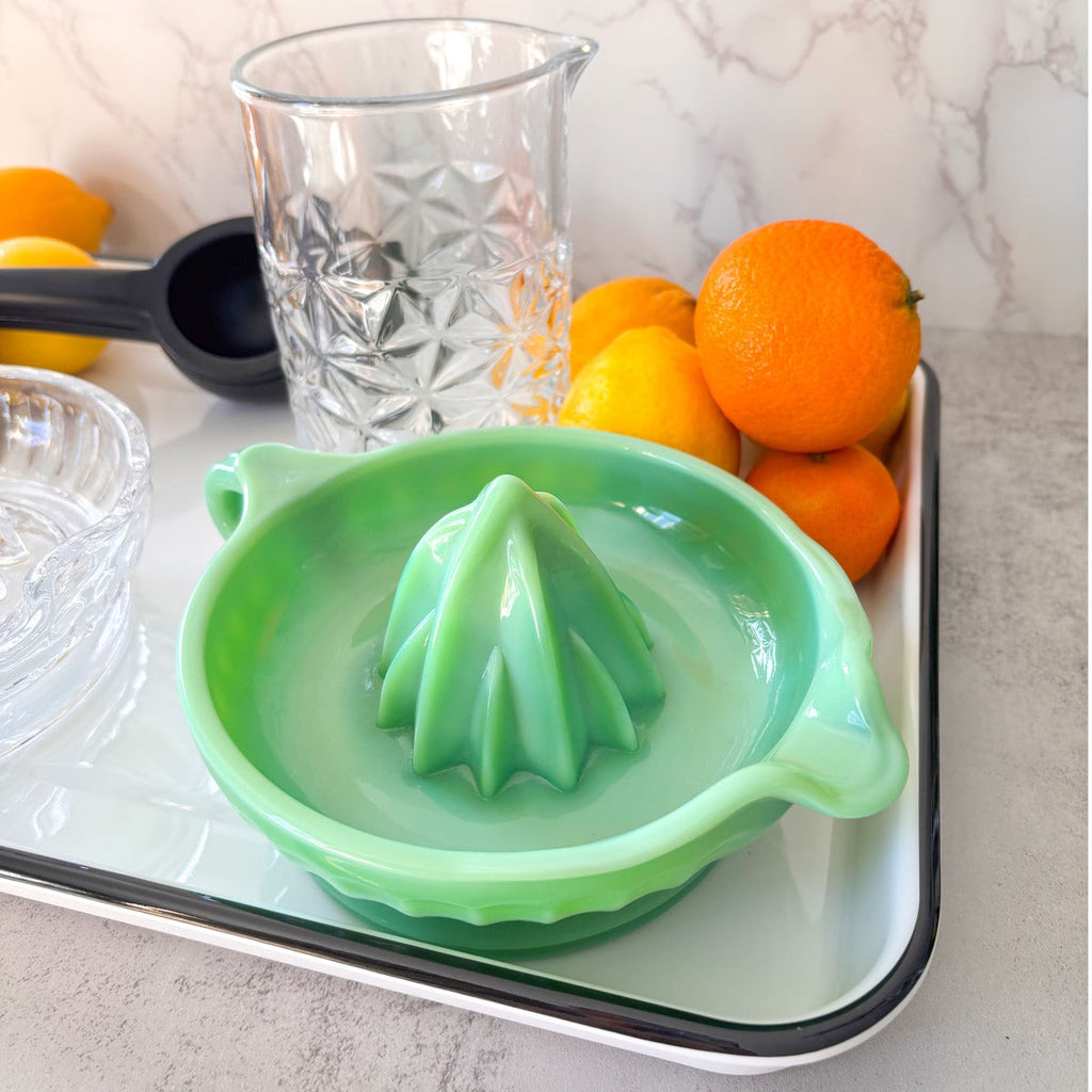 When life hands you lemons, grab this charming green glass Juicer and make lemonade. The classic design includes a handle for easy transporting or pouring, and a 6" diameter to accommodate even the larger citrus fruits.