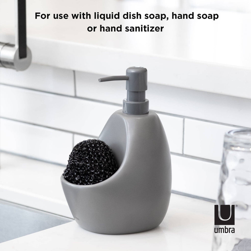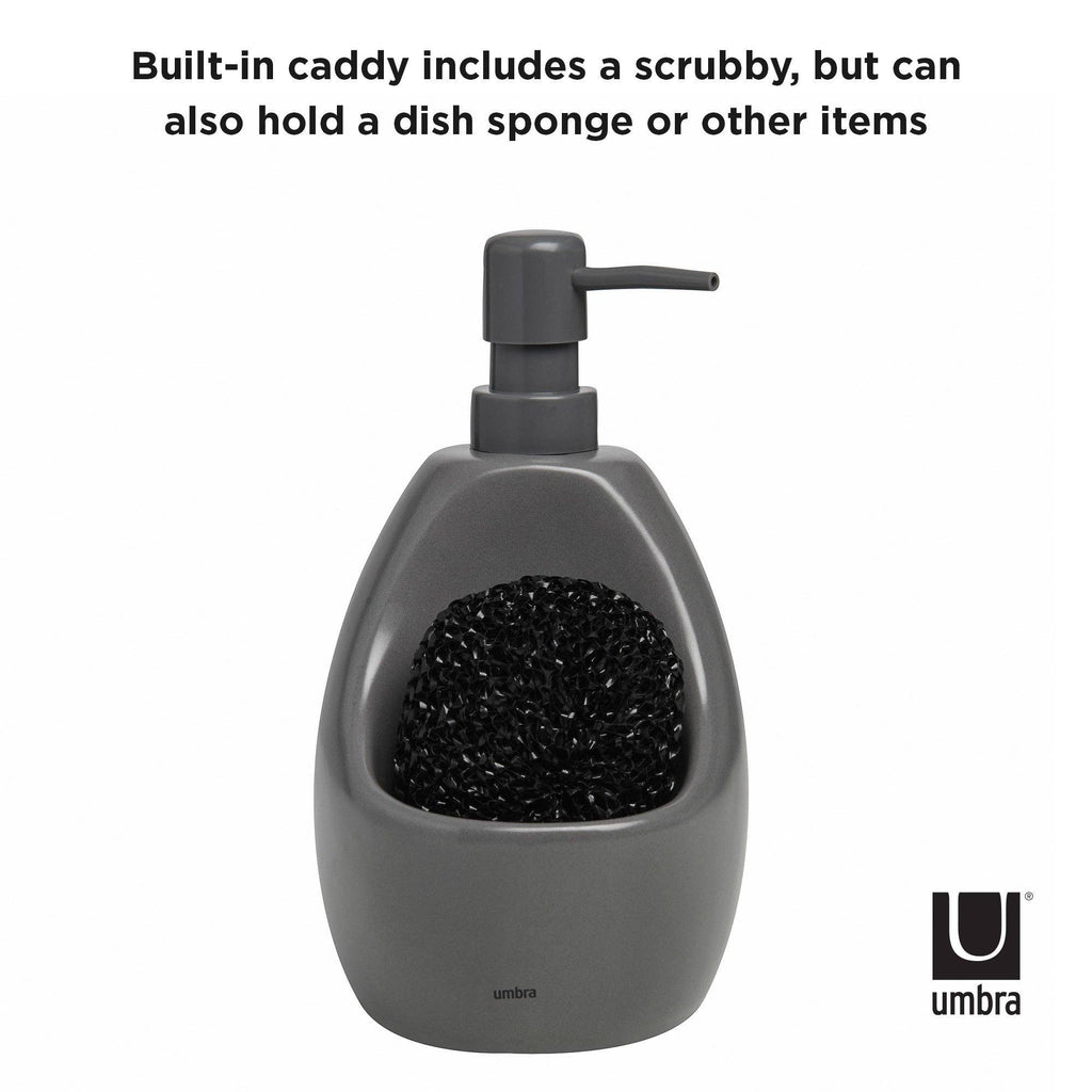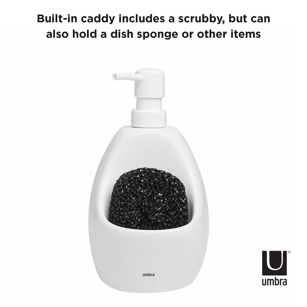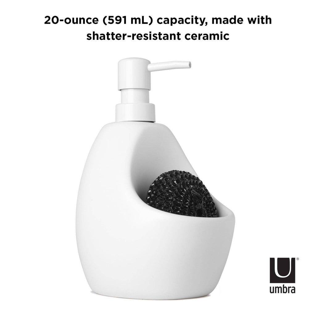 Umbra Joey Soap PumpThe sleek and modern-looking design of Joey Soap Pump will be a great addition to any countertop either in your kitchen or bathroom. Joey’s built-in caddy keeps your kitchen essentials like a scrubby (included) neatly organized, while at the same time offering easy single-handed pump operation due to its sturdy and heavy ceramic material. Joey is loved for its versatility as its built-in caddy offers neat storage space for your bathroom essentials such as hair elastics, bobby pins, hair clips or dental floss – it’s great for all the little essentials cluttering up your countertop that make it so much more annoying to clean.