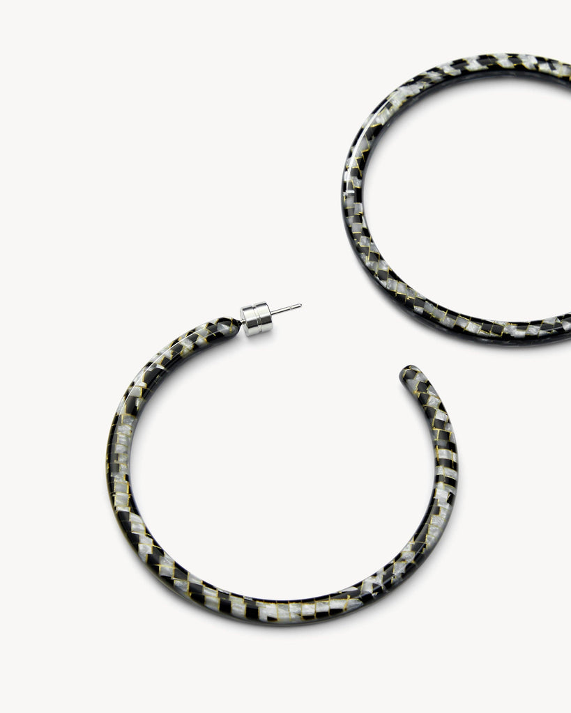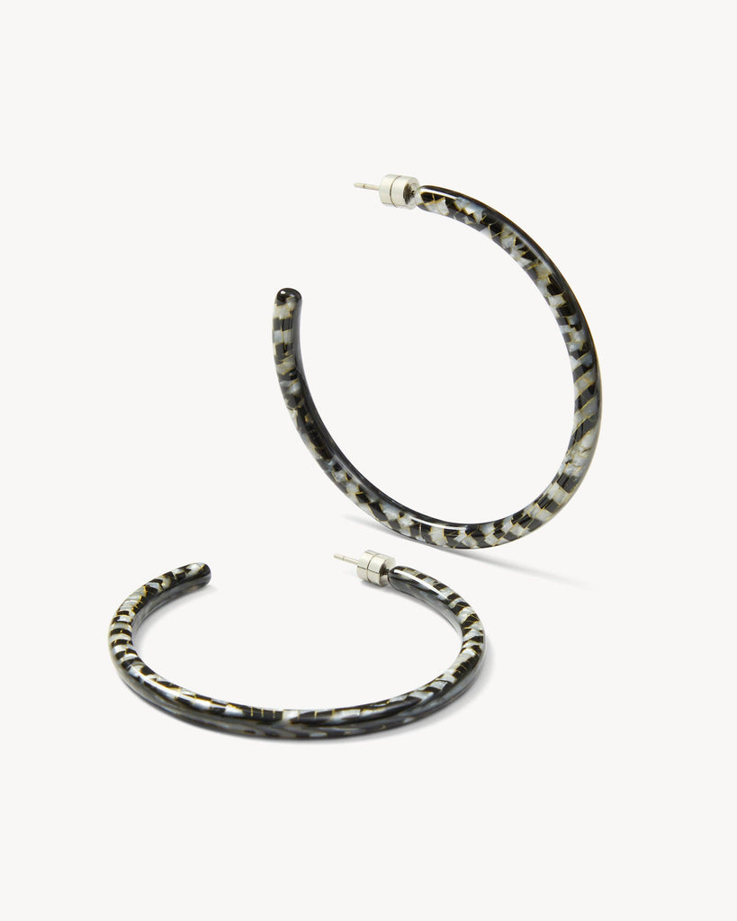 Oversized hoop earrings made from lightweight Italian acetate with engraved barrel backings.
