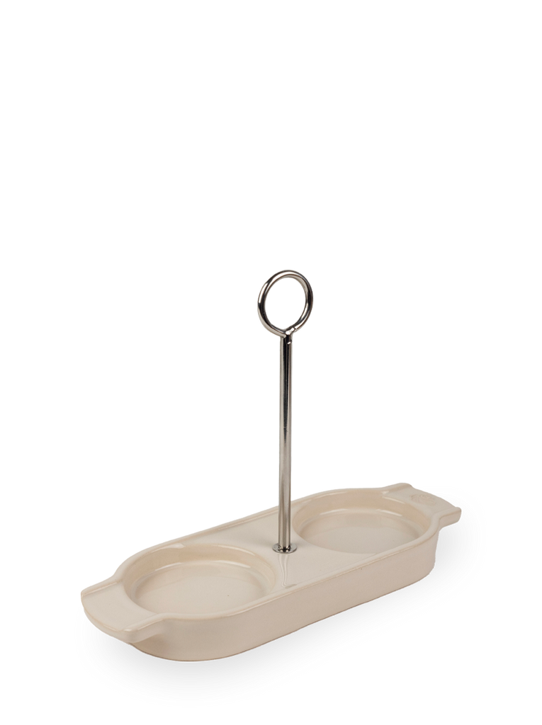 To display your salt and pepper mills elegantly, select the Linéa ceramic tray. Made in France, at our Brittany ceramics factory, this tray gives you a way to store and display your duo of mills without leaving any salt or pepper residue on your surfaces. The ergonomic stainless steel handle makes it easy to carry the tray from kitchen to table with one hand. Easy to clean with a damp cloth or sponge, the Linéa tray is an essential everyday accessory.