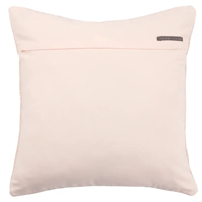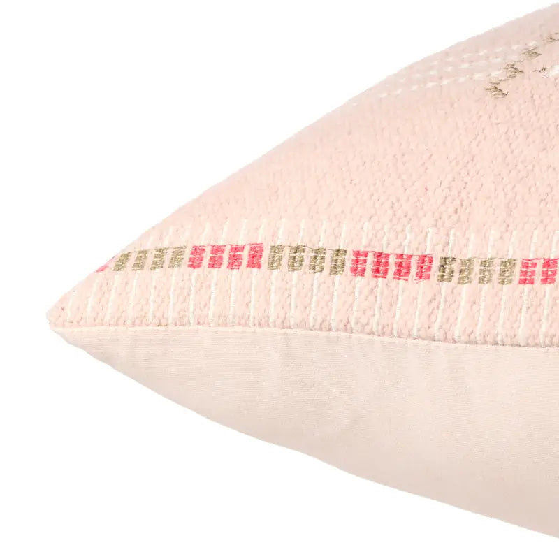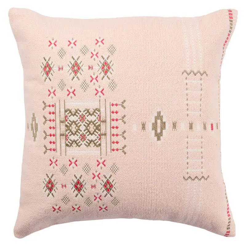 Inspired by Moroccan Sabra styles, the Puebla collection boasts vibrant color palettes and intricate tribal embroidery. The Maram throw pillow features an on-trend blush colorway with rich brown, pink, and white details accenting the textural, India-sourced wool weave.