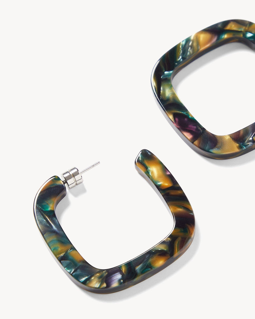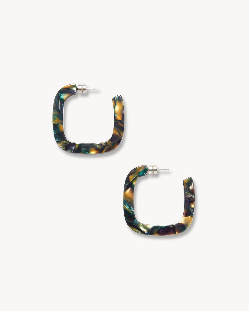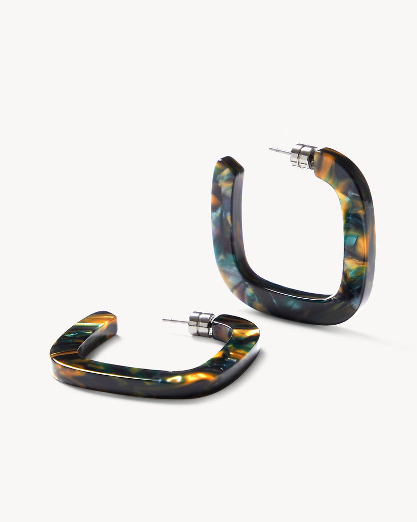 1.5” squared hoop earrings, handcrafted from our lightweight Italian acetate with engraved barrel backings. Made in Italy.