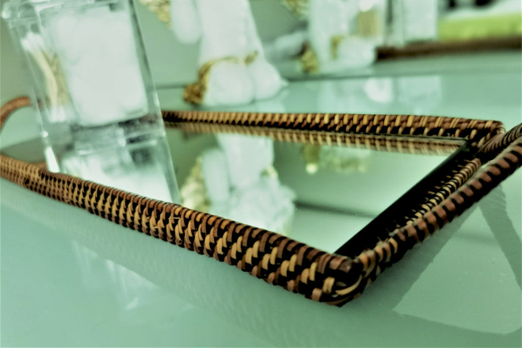 Organize in style with our handwoven vanity trays inspired by rich earth tones derived from natural vines. The mirrored surface reflects whatever you choose to display and provides a harmonious shade, making it a modern decorative addition to your bathroom, bedroom, kitchen, and beyond.