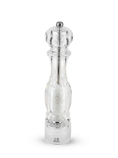 In their transparent showcase, the peppercorns or salt held within the Nancy mill are an invitation to an adventure through flavors. With its timeless design, the Peugeot Nancy mill is essential for the table and the kitchen. Produced entirely in acrylic, it shows off its contents and means that the reservoir being empty is never a sudden surprise. The adjustment knob, placed on the top of the mill, is used to adjust grinding precisely, from the finest to the coarsest, to exactly match the flavors that you want.
