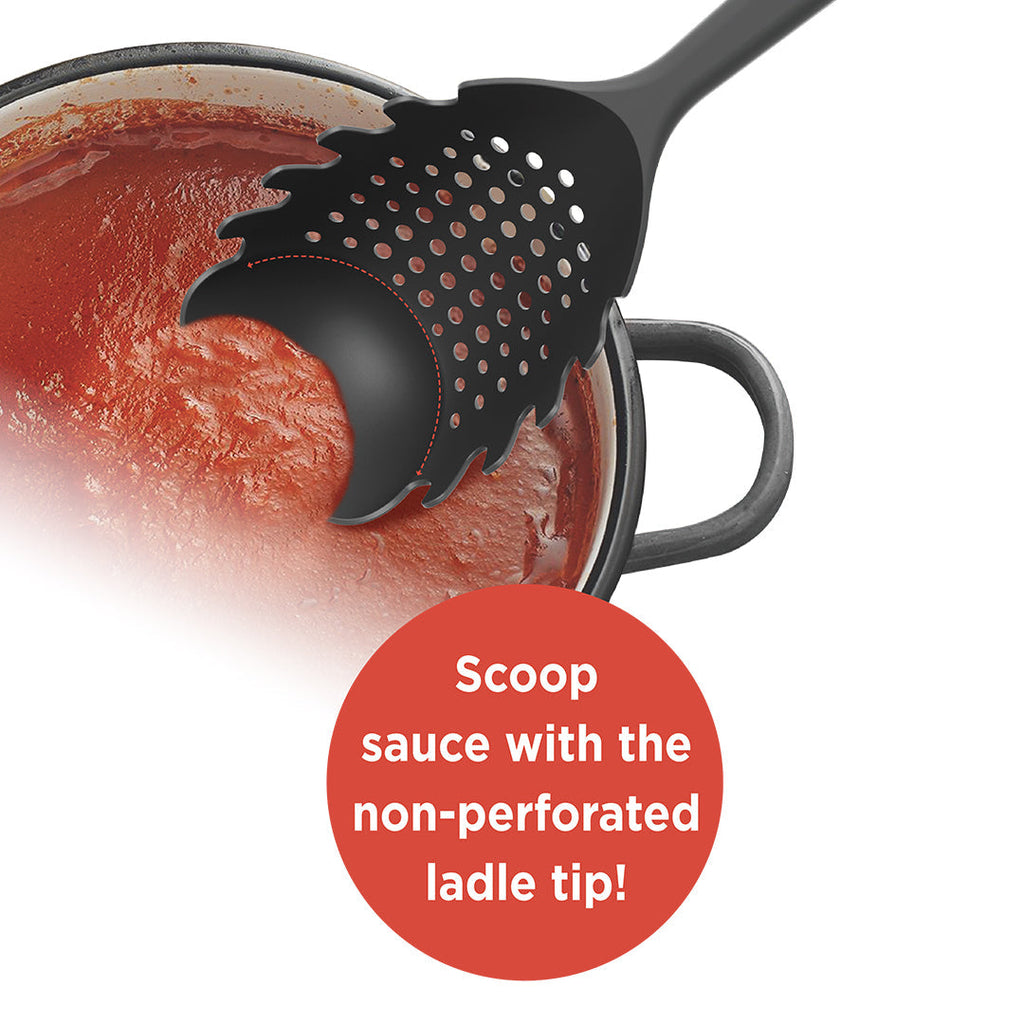 - Integrated ladle tip makes it easy to add sauce to freshly strained pasta
