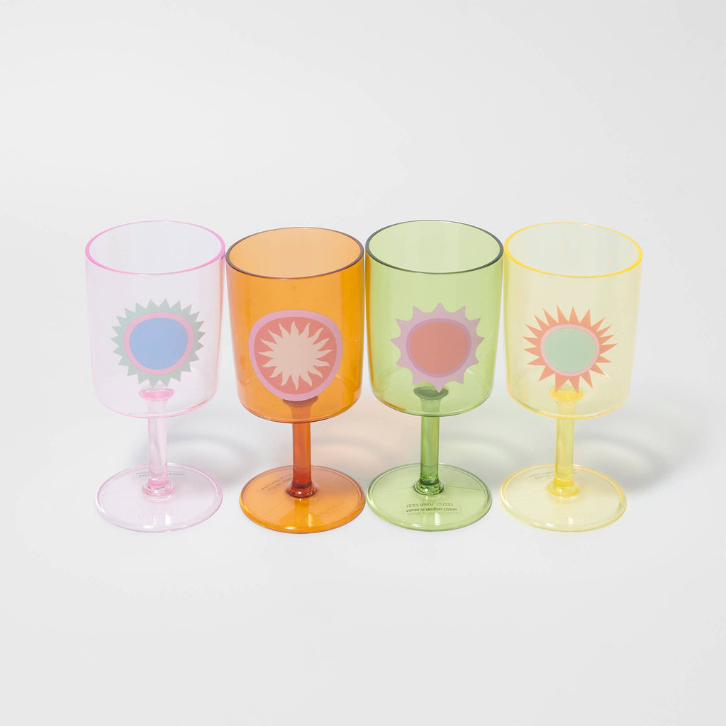 Enjoy poolside beverages and sip with us. The Rio Sun Poolside Wine Glass Set Of 4 is vibrant, sun-loving, and ready to entertain. Designed with style, strength, and durability in mind, this set of 4 can be on the go with you and serve up your favorite tropical drinks. Made from water resistant polystyrene, just add ice and pour over your beverage of choice. Refresh your style and taste buds with its sun print that will have you radiating the carefree spirit of summer.