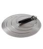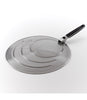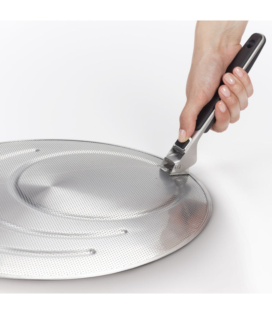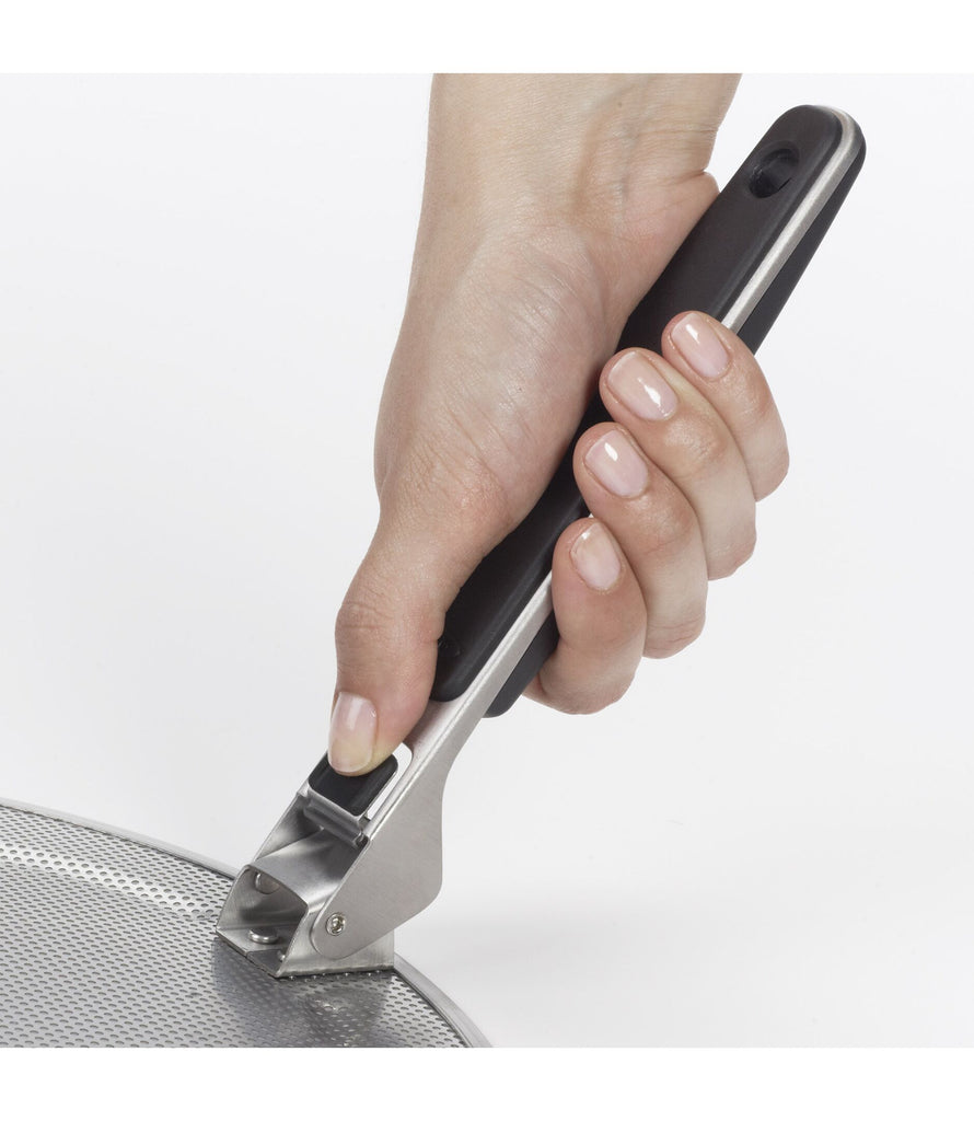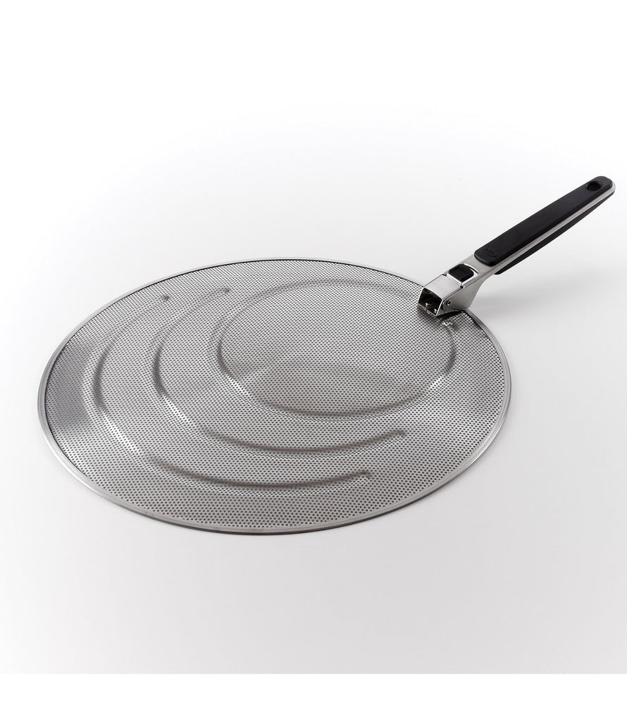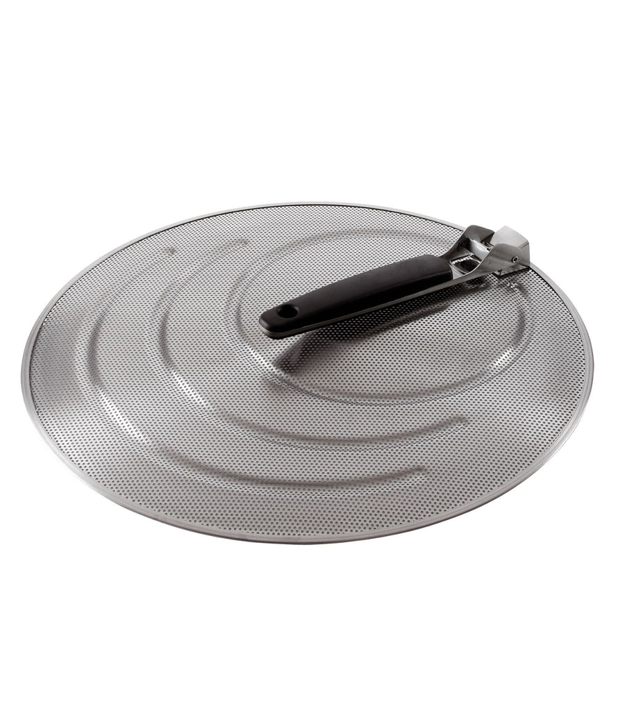 Made of perforated stainless steel, our Splatter Screen keeps grease off of countertops, stoves and, most importantly, cooks. Fits pans up to 13 inches wide, with grooved rings to rest on different sized pans. The soft handle locks in the open position and folds down for compact storage.