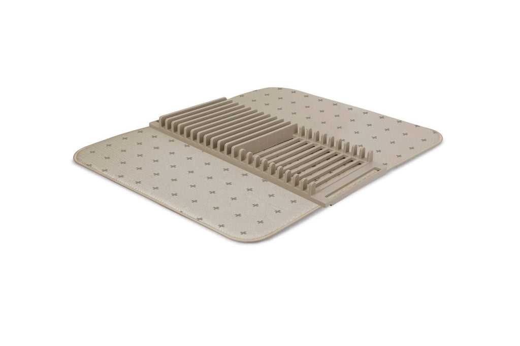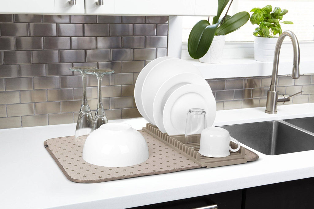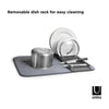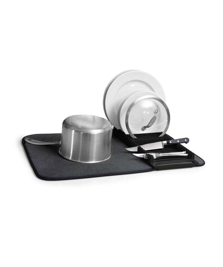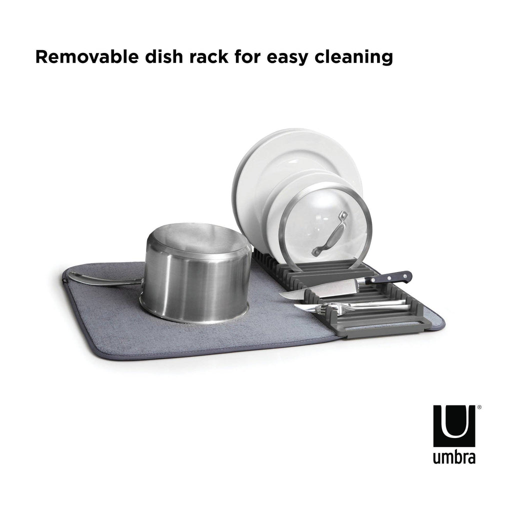 Umbra UDry Dish Rack with Drying Mat. UDry is an innovative solution to dry dishes quickly and easily. Its versatile design combines a dish rack, utensil caddy, stemware holder and machine washable drying mat. This easy-to-use dish rack holds 18 plates, making it easy and quick to dry your dishes. Constructed of durable polypropylene, the lightweight, microfiber mat absorbs water from drying dishes, while also protecting countertops from scratching and water buildup. UDry is optimal when in use, and when not idle, compactly folds up to store in cupboards and leave your counter clutter-free. The space-saving drying solution provides storage and organization, while simultaneously acting as a functional drying mechanism.