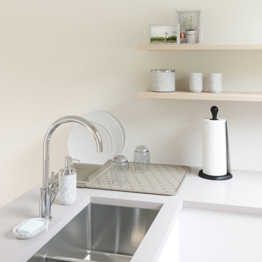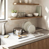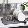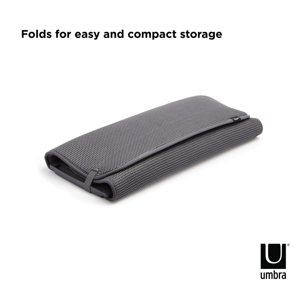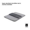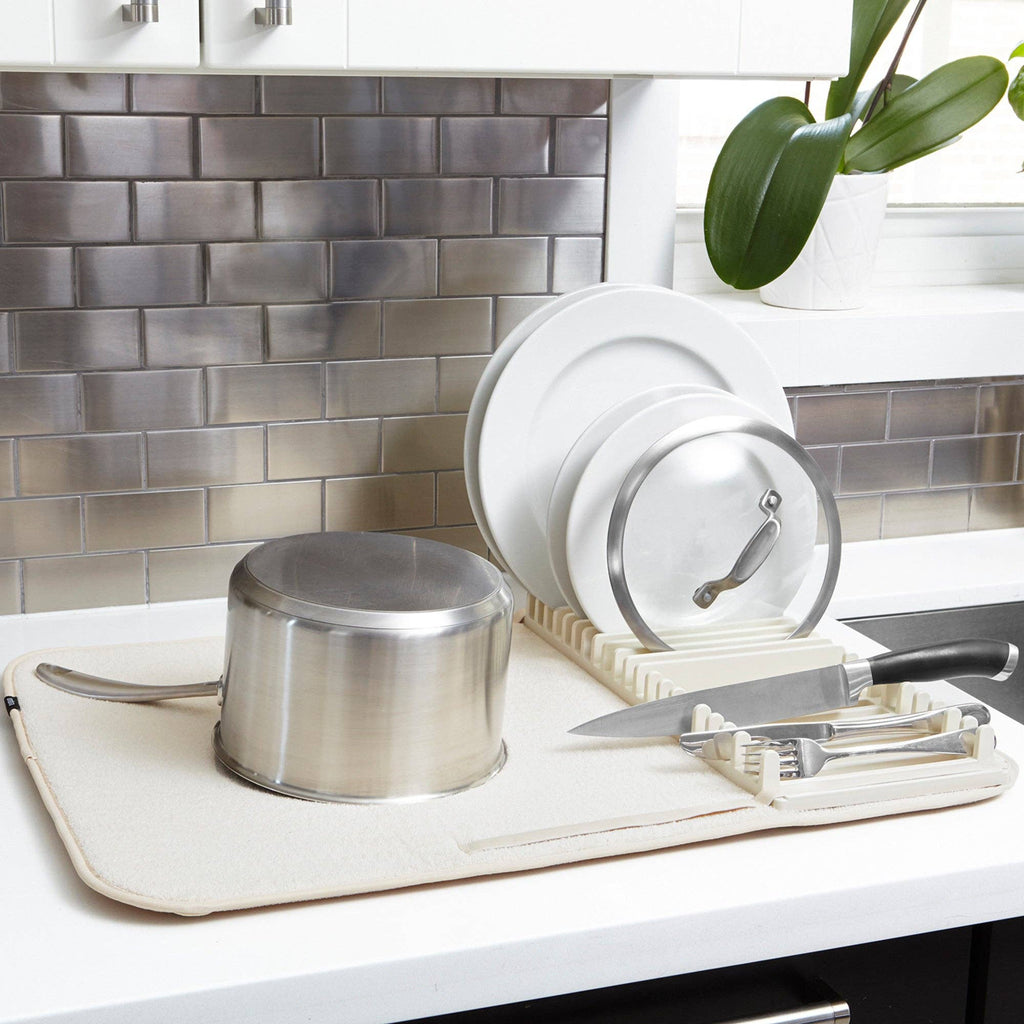 Umbra UDry Dish Rack with Drying Mat. UDry is an innovative solution to dry dishes quickly and easily. Its versatile design combines a dish rack, utensil caddy, stemware holder and machine washable drying mat. This easy-to-use dish rack holds 18 plates, making it easy and quick to dry your dishes. Constructed of durable polypropylene, the lightweight, microfiber mat absorbs water from drying dishes, while also protecting countertops from scratching and water buildup. UDry is optimal when in use, and when not idle, compactly folds up to store in cupboards and leave your counter clutter-free. The space-saving drying solution provides storage and organization, while simultaneously acting as a functional drying mechanism.