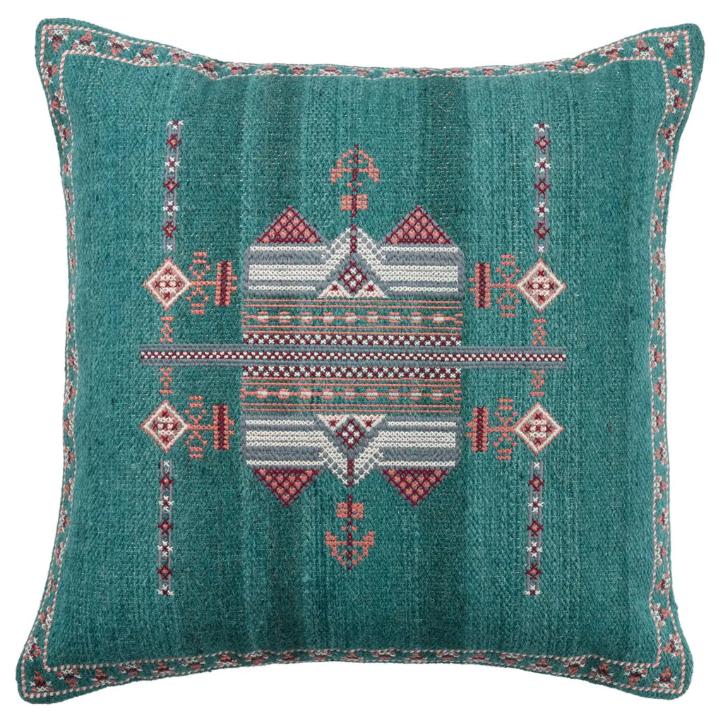Inspired by Moroccan Sabra styles, the Puebla collection boasts vibrant color palettes and intricate tribal embroidery. The Zaida throw pillow features an on-trend teal and terracotta colorway with white details and a textural, India-sourced wool weave.