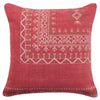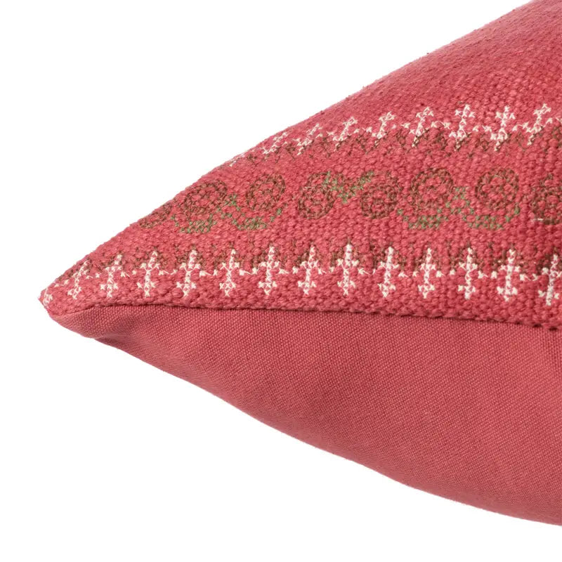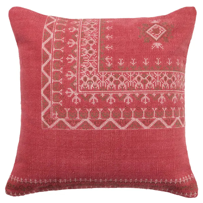 Inspired by Moroccan Sabra styles, the Puebla collection boasts vibrant color palettes and intricate tribal embroidery. The Abeni throw pillow features a vibrant red colorway with earthy brown and white details accenting the textural, India-sourced wool weave.