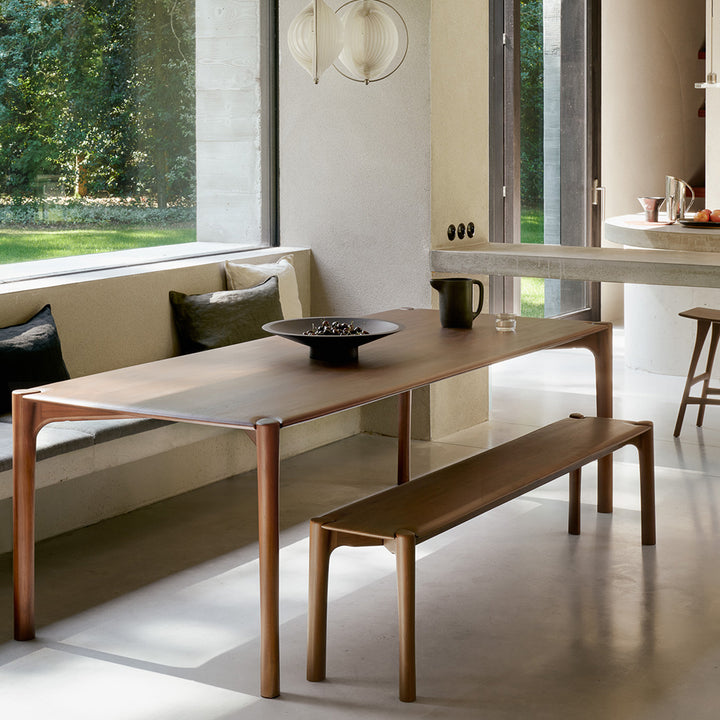 The PI bench honors nature’s design by keeping the strength, curves, and lines, as Mother Nature intended. Each PI dining table is finished by hand to ensure that the individual character of the wood is respected. A unique organic modern Japandi dining furniture design by Alain van Havre for Ethnciraft.