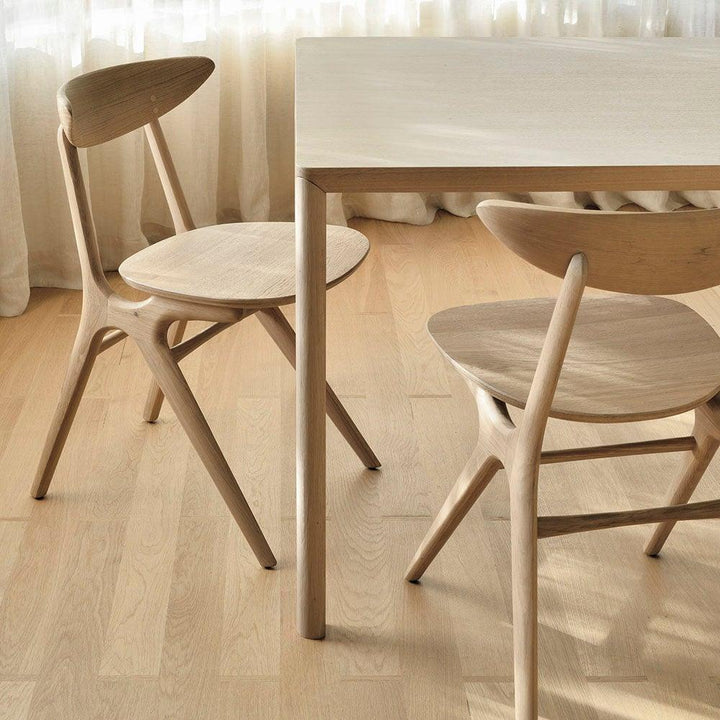 With sleek, angular connectors, the Eye dining chair is a solid wood seating design hallmark. The curved backrest, reminiscent of a winked eye, inspired the chair's name. Think subtle elegance with a stylish edge—the minimalist Scandinavian design pairs well with various modern dining styles.