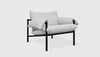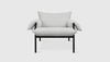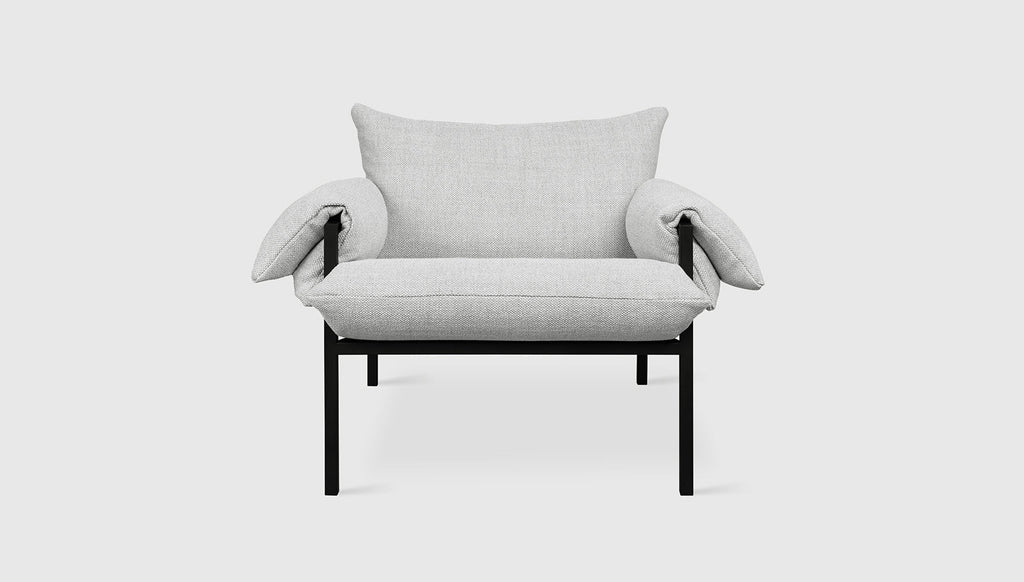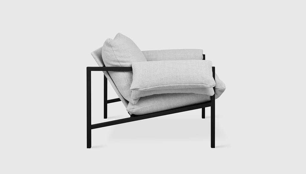 Ease back and relax with the Fulton Chair, a study in aesthetic balance and proportion that contemporizes Brazilian Mid-century style. Cushion-wrapped arms and plush, organic upholstery take the edge off a sturdy steel foundation, angled precisely to achieve just the right combination of comfort and support. The mixed materials work harmoniously to create an original design that will draw you in and soothe both body and mind. Works well in pairs and is suitable for residential or commercial interiors.