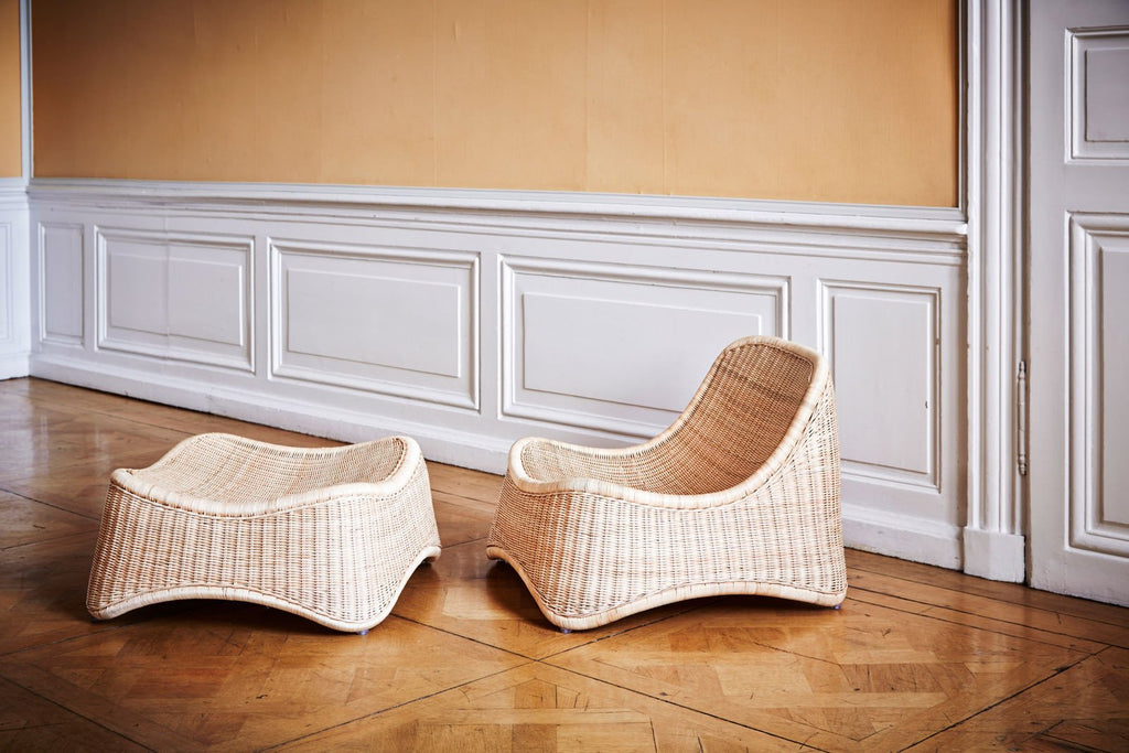 The beautiful rattan lounge chair Chill with footstool was designed in the late summer of 1961 by Nanna Ditzel. Chill is a sculptural piece that effortlessly integrates body with furniture. The lounge chair is designed for indoor use. The chair along with the footstool ties an organic design language with minimalistic features and suggests indulgence and relaxation.