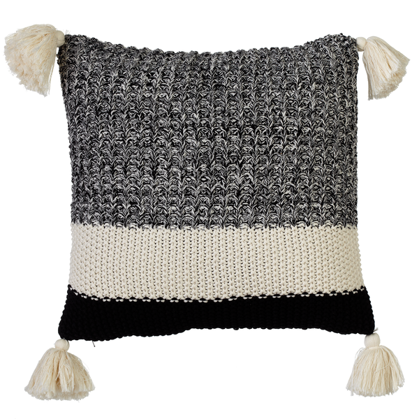 Black & White Texture Block Knit Pillow with Tassels. Cotton knit.