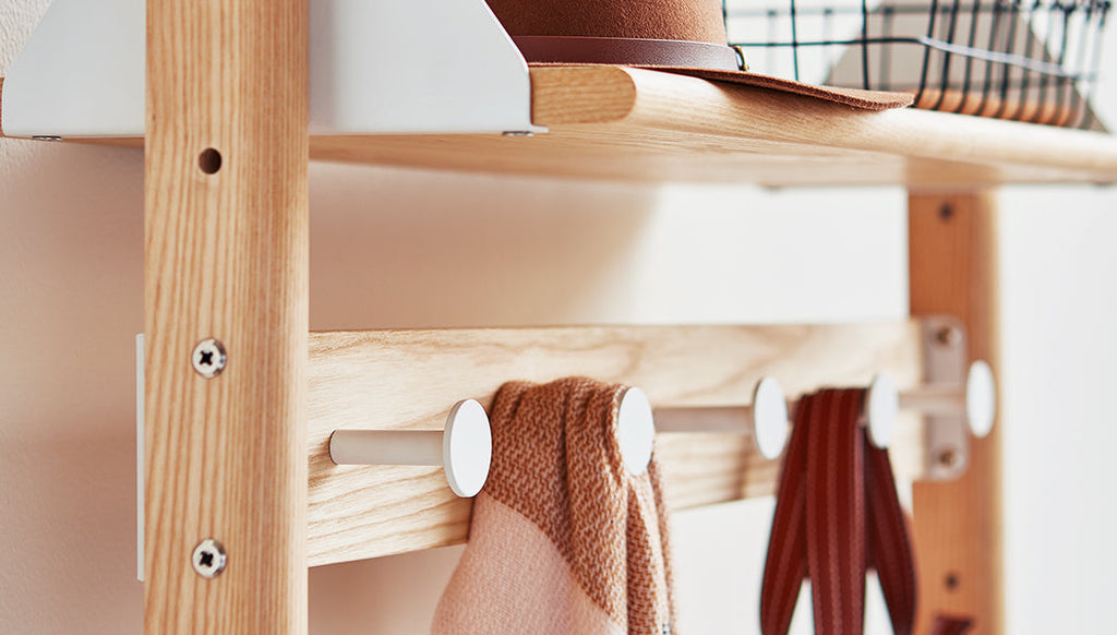Solid ash Uprights, Slatted Shelves, Hook Rail and Side Tray are all 100% FSC®-Certified in support of responsible forest management (FSC® 092551).