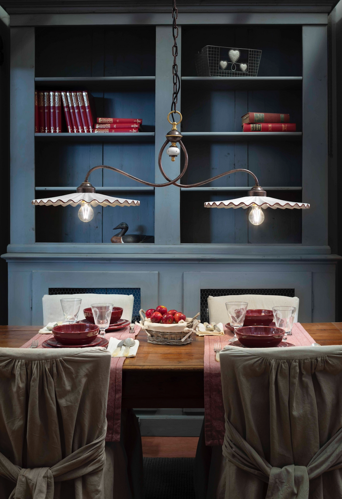 Pleated ceramic diffusors with hand-painted contours highlight the artistry of craftsmen dedicated to preserving ancient traditions. A line that lends itself well to the furnishing of not only domestic environments but also public spaces with a classic or country style.