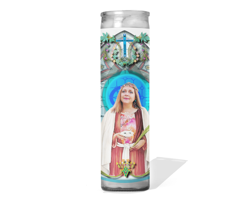 Carole Baskin Celebrity Prayer Candle - Tiger King Saint Celebrity Prayer Candle. White wax. 8 Inches Tall. Glass Container. High Quality Gloss Vinyl Label.