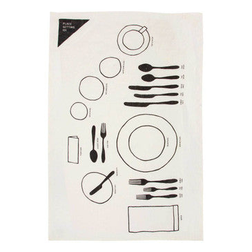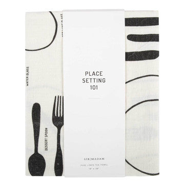 The Place Setting 101 tea towel, featuring a helpful and playful diagram that would make Emily Post proud, is inspired by an English tea towel and made from pure linen to avoid surface lint when drying delicate china and glassware. Individually printed using silk screens, each towel is cut from running yardage that comes off the loom with selvage sides before we hem it by hand.