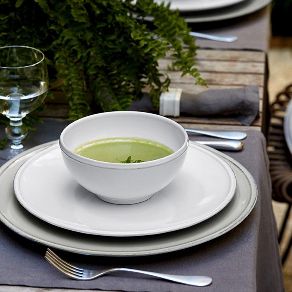 Found in some of the finest hotels and restaurants around the world, the Friso collection sets the standard for elegant simplicity, unlimited versatility, and exceptional durability. Featuring a subtle grooved edge hand-painted by skilled artisans, it retains a new attitude in stoneware for entertaining or casual everyday use.