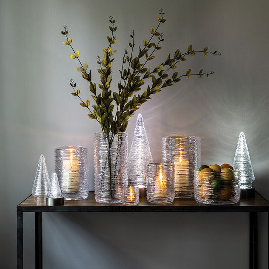 In a bold interpretation of the craft, master glassblowers nimbly wrap fine strands of glass around a cylindrical base to form the unique, natural silhouette of each candle holder. Whether frozen in winter, or flowing in summer - this piece was inspired by the constantly changing rivers, streams and waterways in Vermont.