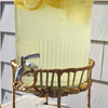 Refined clear glass design with ridged bands & floral accents, robust stainless steel spigot, neutral brown rubber seal and 4-legged metal stand with natural leaf wrap.