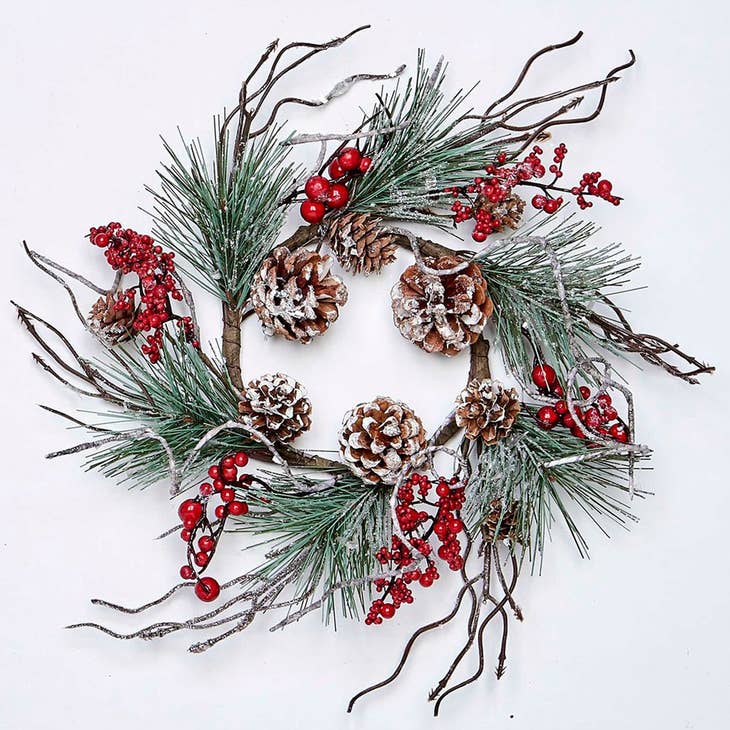 With a realistic frosted look, our candle ring includes frosted pine cones, berries, twigs, and needle pine. You can bend the pine to shape as you like, making this candle ring a great accent to any Christmas décor.