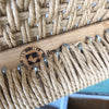 Teak with woven seat.