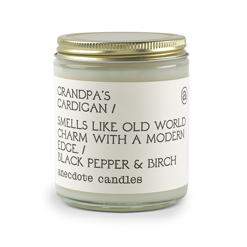A new take on an old classic, Grandpa’s Cardigan is a scent of contrasts. Smoky birch notes are layered with spicy scents of black pepper and cardamom. Hints of mandarin and jasmine add a soft finish to the smoke and spice.