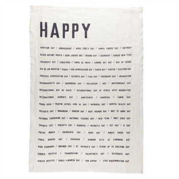 Our Happy towel lists commemorates a plethora of holidays, remembrances, and annual events, making it a supremely universal gift. Inspired by traditional English tea towels — made from pure linen to avoid surface lint when drying delicate china and glassware — each towel is printed using silk screens and cut from running yardage that comes off the loom with selvage sides before we hem it by hand.