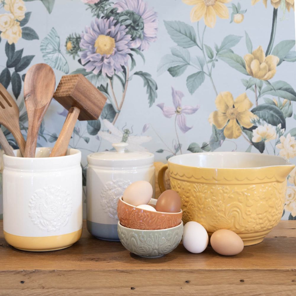 Bright yellow-colored glaze with an embossed pattern brings a farm-friendly charm to your kitchen