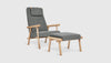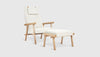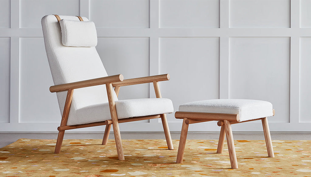 A rugged, eco‐friendly take on modernism, the Labrador is a unique design that invokes calm and lightness, with elements reduced to their essential forms. Its Scandinavian‐inspired look is achieved using natural materials like solid ash and hand‐stitched leather. Wood is FSC®‐ Certified to support responsible forest management, and faux‐wool coverings are made from 100% recycled plastic bottles, diverted from landfills and waterways, then repurposed into a plush upholstery material. The headrest can be adjusted using a clever leather and wood counterweight to achieve optimal lounging position, enhanced even further by a matching footrest.
