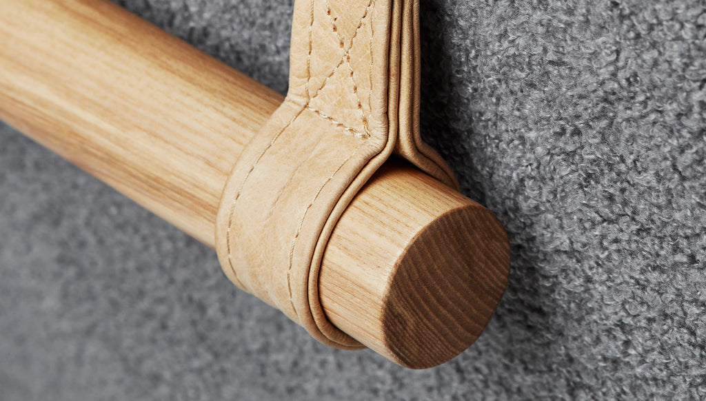 - Removable, adjustable headrest features a solid wood dowel counterweight with leather straps in Canyon Whiskey leather.