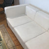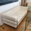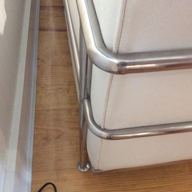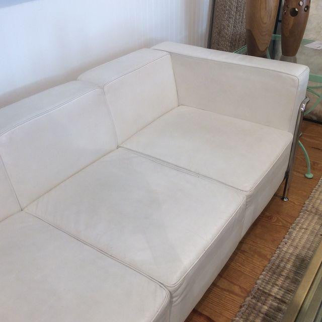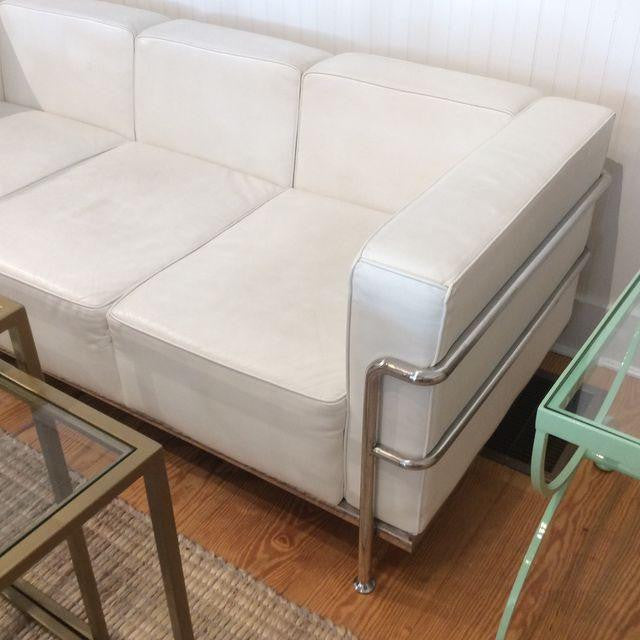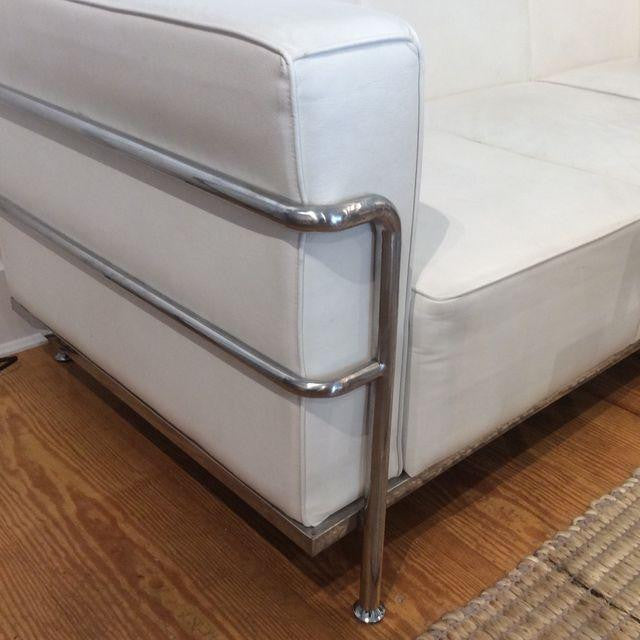 Vintage white leather three-seat sofa in the style of Le Corbusier. Chrome and stainless steel frame, high-density seat and back. Super comfortable. Only minor scuff marks and nicks to the leather. Very light dirt stains, but can easily be cleaned.