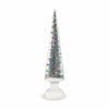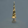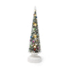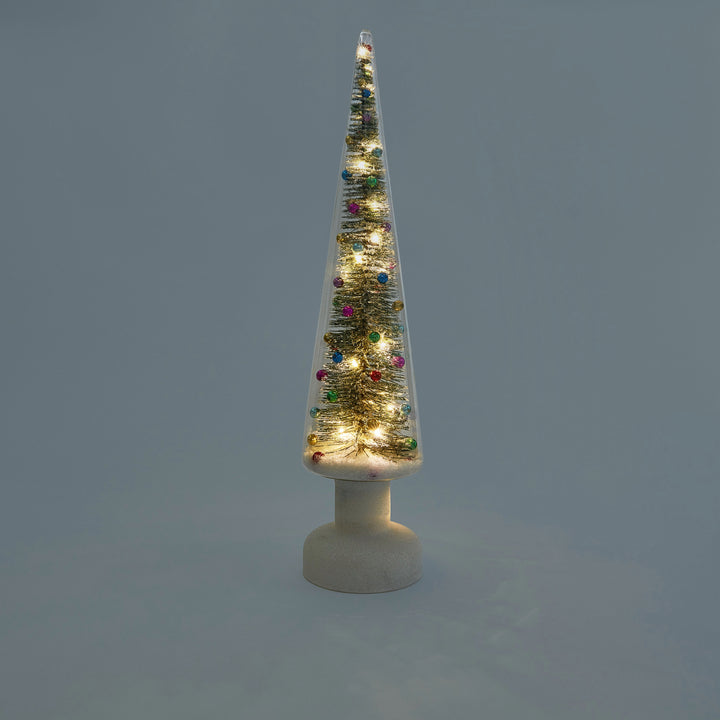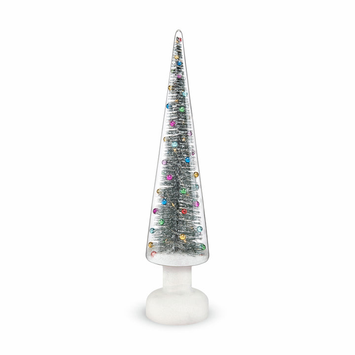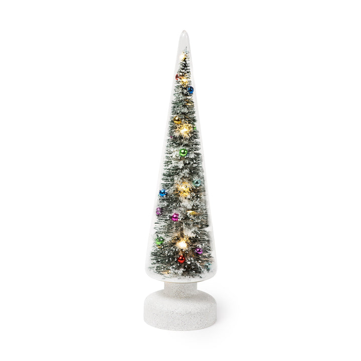 LED lights inside this glass LED Snowy Wonderland Tree create a celebratory glow that highlights the snow-covered tree within. Requires 3 AA batteries (not included).